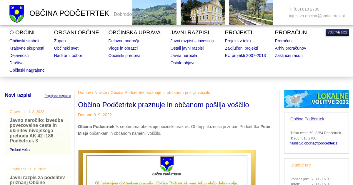 Občina Podčetrtek 9. septembra obeležuje občinski praznik. Ob tej priložnosti je župan Podčetrtka Peter Misja občankam in občanom namenil voščilo.