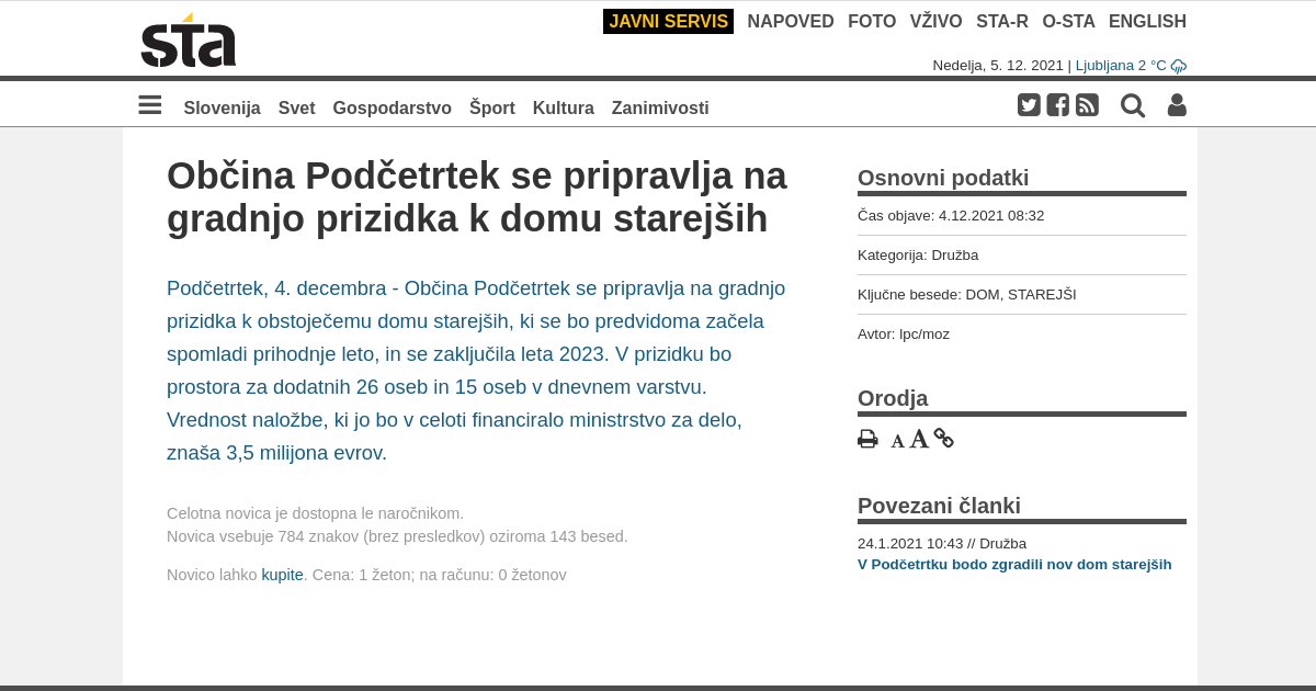 Občina Podčetrtek se pripravlja na gradnjo prizidka k obstoječemu domu starejših, ki se bo predvidoma začela spomladi prihodnje leto, in se zaključila leta 2023. V prizidku bo prostora za dodatnih 26 oseb in 15 oseb v dnevnem varstvu. Vrednost naložbe, ki jo bo v celoti financiralo ministrstvo za delo, znaša 3,5 milijona evrov.