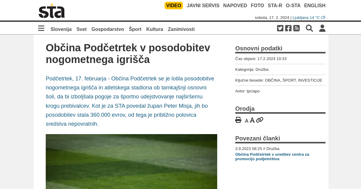 Občina Podčetrtek se je lotila posodobitve nogometnega igrišča in atletskega stadiona ob tamkajšnji osnovni šoli, da bi izboljšala pogoje za športno udejstvovanje najširšemu krogu prebivalcev. Kot je za STA povedal župan Peter Misja, jih bo posodobitev stala 360.000 evrov, od tega je približno polovica sredstva nepovratnih.