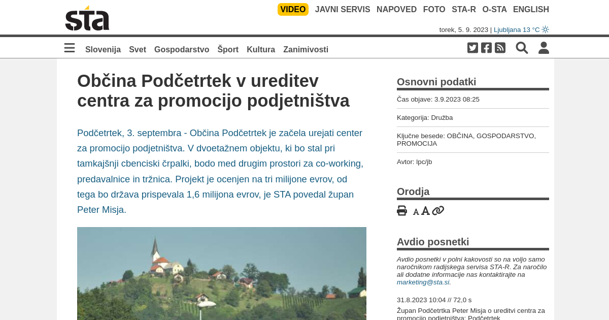 Občina Podčetrtek je začela urejati center za promocijo podjetništva. V dvoetažnem objektu, ki bo stal pri tamkajšnji cbenciski črpalki, bodo med drugim prostori za co-working, predavalnice in tržnica. Projekt je ocenjen na tri milijone evrov, od tega bo država prispevala 1,6 milijona evrov, je STA povedal župan Peter Misja.