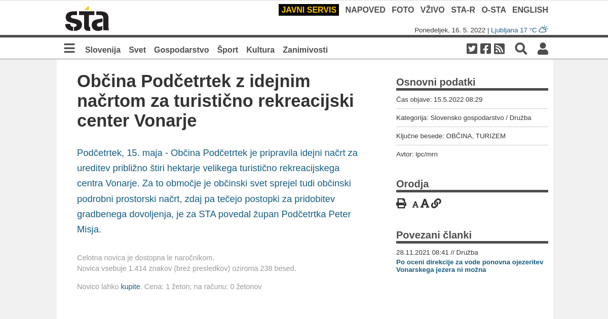 Občina Podčetrtek je pripravila idejni načrt za ureditev približno štiri hektarje velikega turistično rekreacijskega centra Vonarje. Za to območje je občinski svet sprejel tudi občinski podrobni prostorski načrt, zdaj pa tečejo postopki za pridobitev gradbenega dovoljenja, je za STA povedal župan Podčetrtka Peter Misja.