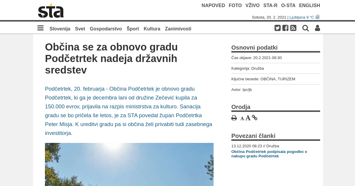 Občina Podčetrtek je obnovo gradu Podčetrtek, ki ga je decembra lani od družine Zečević kupila za 150.000 evrov, prijavila na razpis ministrstva za kulturo. Sanacija gradu se bo pričela še letos, je za STA povedal župan Podčetrtka Peter Misja. K ureditvi gradu pa si občina želi privabiti tudi zasebnega investitorja.