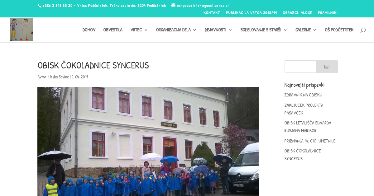V petek, 5. aprila 2019, smo otroci in strokovni delavci 1. in 2. oddelka obiskali čokoladnico Syncerus v Olimju. V okviru prireditve »Vino in čokolada« nas je ponovno k sodelovanju povabil TIC Podčetrtek, ki nam je organiziral vožnjo s turističnim vlakom Hlapon in ogled čokoladnice. V čokoladnici Syncerus nas je sprejela gospa Tadeja, ki nam je predstavila zgodovino čokoladnice in postopek izdelave čokolade. Ob koncu predstavitve smo poskusili čokolado in si ogledali prodajalno. Načrtovali smo še ogled minoritskega samostana in zeliščnega vrta, vendar nam je ponagajalo deževno vreme. Ob vrnitvi v vrtec smo med vožnjo prepevali in opazovali okolico. Za marsikaterega otroka je bila to prva vožnja s cestnim vlakom, kakor tudi prvi obisk čokoladnice. Presenečenj, pa še ni bilo konec. Ob vrnitvi v vrtec nas je obiskala gospa Mateja Videtič, ter nas obdarila s čokoladnimi velikonočnimi zajčki. Čokoladnici Syncerus, TIC-u Podčetrtek in podjetju Hlapon se zahvaljujemo za »sladek« dan.