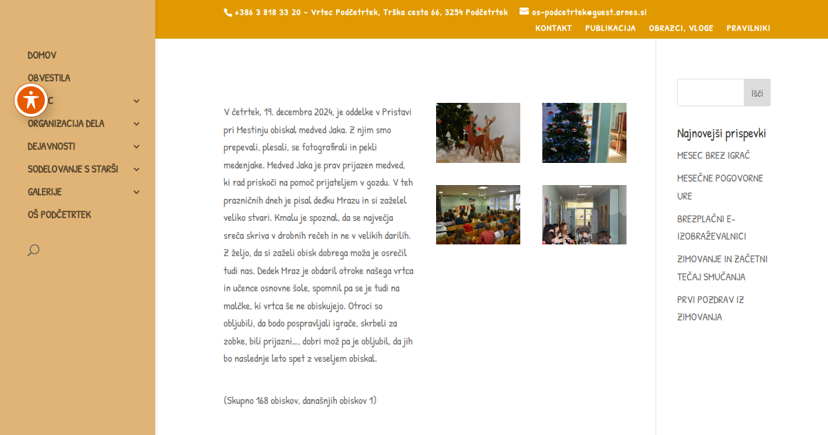 V četrtek, 19. decembra 2024, je oddelke v Pristavi pri Mestinju obiskal medved Jaka. Z njim smo prepevali, plesali, se fotografirali in pekli medenjake. Medved Jaka je prav prijazen medved, ki rad priskoči na pomoč prijateljem v gozdu. V teh prazničnih dneh je pisal dedku Mrazu in si zaželel veliko stvari. Kmalu je spoznal, da se največja sreča skriva v drobnih rečeh in ne v velikih darilih. Z željo, da si zaželi obisk dobrega moža je osrečil tudi nas. Dedek Mraz je obdaril otroke našega vrtca in učence osnovne šole, spomnil pa se je tudi na malčke, ki vrtca še ne obiskujejo. Otroci so obljubili, da bodo pospravljali igrače, skrbeli za zobke, bili prijazni…, dobri mož pa je obljubil, da jih bo naslednje leto spet z veseljem obiskal.