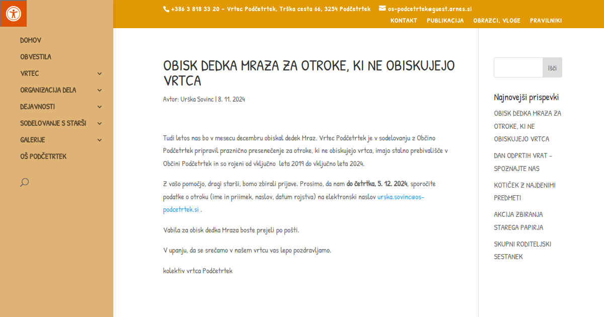 Tudi letos nas bo v mesecu decembru obiskal dedek Mraz. Vrtec Podčetrtek je v sodelovanju z Občino Podčetrtek pripravil praznično presenečenje za otroke, ki ne obiskujejo vrtca, imajo stalno prebivališče v Občini Podčetrtek in so rojeni od vključno leta 2019 do vključno leta 2024.