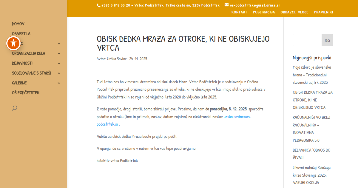 Tudi letos nas bo v mesecu decembru obiskal dedek Mraz. Vrtec Podčetrtek je v sodelovanju z Občino Podčetrtek pripravil praznično presenečenje za otroke, ki ne obiskujejo vrtca, imajo stalno prebivališče v Občini Podčetrtek in so rojeni od vključno leta 2020 do vključno leta 2025.