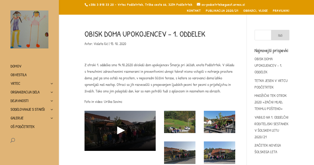 Z otroki 1. oddelka smo 14.10.2020 obiskali dom upokojencev Šmarje pri Jelšah, enota Podčetrtek. V skladu s trenutnimi zdravstvenimi razmerami in preventivnimi ukrepi tokrat nismo vstopili v notranje prostore doma, pač pa smo ostali na prostem, v neposredni bližini terase, s katere so varovanci doma lahko spremljali naš nastop. Otroci so jih razveselili s prepevanjem ljudskih pesmi ter pesmi o prijateljstvu in živalih. Tako smo jim polepšali dan, kar so nam potrdili tudi z aplavzom in nasmehom na obrazih.