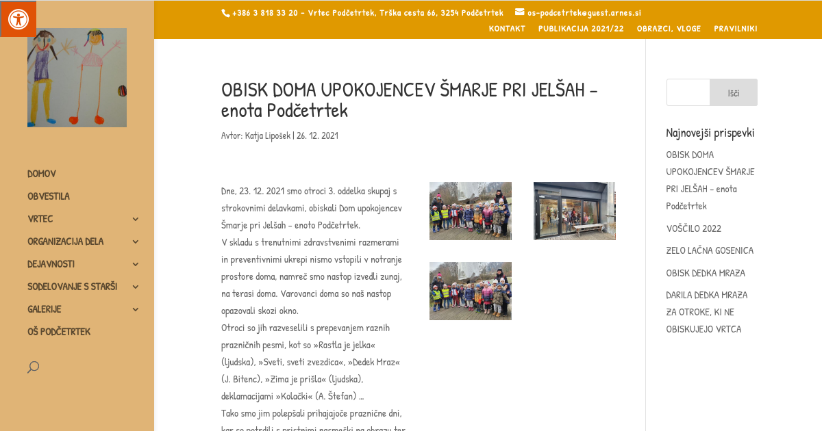 Dne, 23. 12. 2021 smo otroci 3. oddelka skupaj s strokovnimi delavkami, obiskali Dom upokojencev Šmarje pri Jelšah – enoto Podčetrtek. V skladu s trenutnimi zdravstvenimi razmerami in preventivnimi ukrepi nismo vstopili v notranje prostore doma, namreč smo nastop izvedli zunaj, na terasi doma. Varovanci doma so naš nastop opazovali skozi okno. Otroci so jih razveselili s prepevanjem raznih prazničnih pesmi, kot so »Rastla je jelka« (ljudska), »Sveti, sveti zvezdica«, »Dedek Mraz« (J. Bitenc), »Zima je prišla« (ljudska), deklamacijami »Kolački« (A. Štefan) … Tako smo jim polepšali prihajajoče praznične dni, kar so potrdili s pristnimi nasmeški na obrazu ter z aplavzom. Predali smo jim tudi voščilnico.