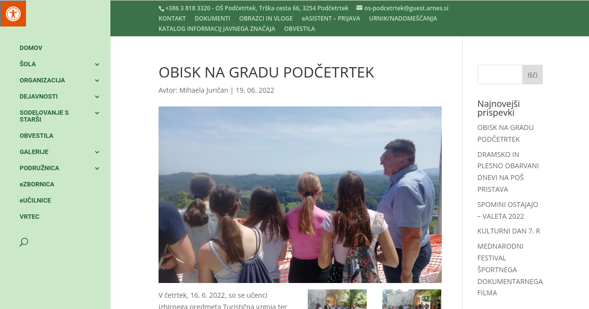 V četrtek, 16. 6. 2022, so se učenci izbirnega predmeta Turistična vzgoja ter na družboslovnih področjih nadarjeni učenci od 5. do 8. razreda skupaj z mentorji odpravili na grad Podčetrtek, kjer je skupino pričakal župan Peter Misja. Učenci in spremljevalci smo dobili edinstveno priložnost, da si še pred dnevom odprtih vrat pod vodstvom župana ogledamo notranjost gradu s številnimi velikimi in majhnimi prostori, napredek pri obnovi in uživamo ob pravih grajskih razgledih. Učenci so z zanimanjem prisluhnili razlagi, si ogledovali sobane in skrivnostne majhne prehode ter si zamišljali, kako je potekalo življenje na gradu nekoč in kaj vse bo moč na gradu doživeti po obnovi.