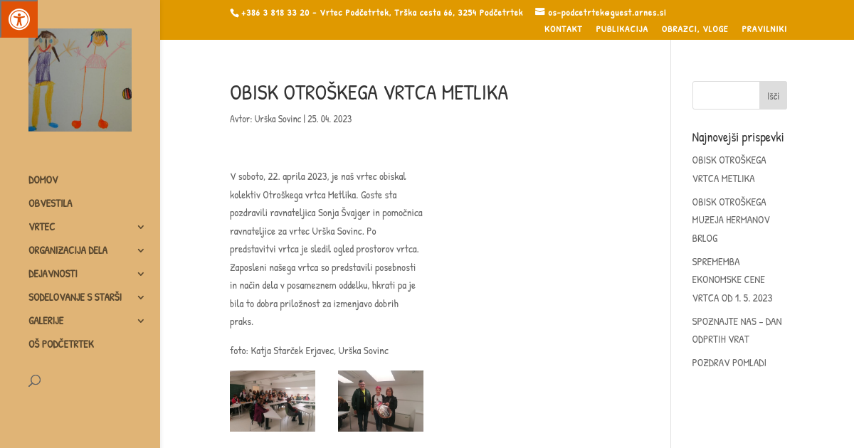 V soboto, 22. aprila 2023, je naš vrtec obiskal kolektiv Otroškega vrtca Metlika. Goste sta pozdravili ravnateljica Sonja Švajger in pomočnica ravnateljice za vrtec Urška Sovinc. Po predstavitvi vrtca je sledil ogled prostorov vrtca. Zaposleni našega vrtca so predstavili posebnosti in način dela v posameznem oddelku, hkrati pa je bila to dobra priložnost za izmenjavo dobrih praks.