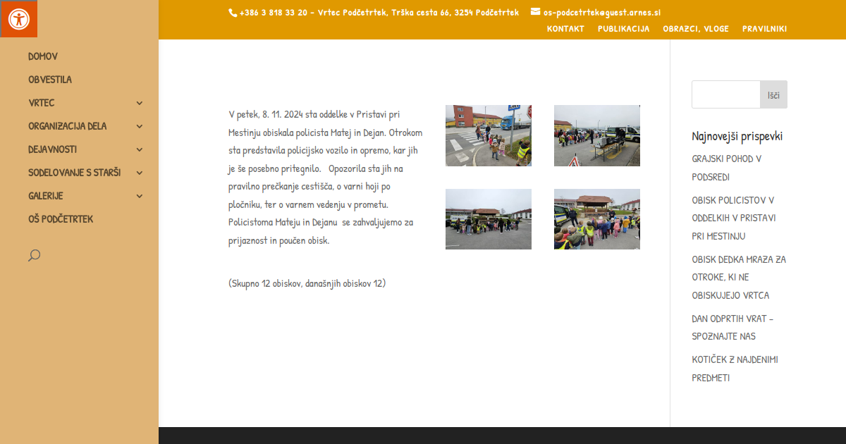 V petek, 8. 11. 2024 sta oddelke v Pristavi pri Mestinju obiskala policista Matej in Dejan. Otrokom sta predstavila policijsko vozilo in opremo, kar jih je še posebno pritegnilo. Opozorila sta jih na pravilno prečkanje cestišča, o varni hoji po pločniku, ter o varnem vedenju v prometu. Policistoma Mateju in Dejanu se zahvaljujemo za prijaznost in poučen obisk.