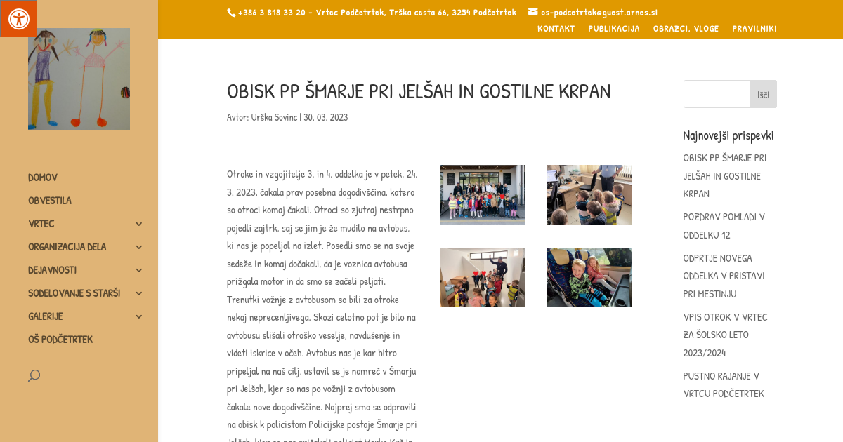 Otroke in vzgojitelje 3. in 4. oddelka je v petek, 24. 3. 2023, čakala prav posebna dogodivščina, katero so otroci komaj čakali. Otroci so zjutraj nestrpno pojedli zajtrk, saj se jim je že mudilo na avtobus, ki nas je popeljal na izlet. Posedli smo se na svoje sedeže in komaj dočakali, da je voznica avtobusa prižgala motor in da smo se začeli peljati. Trenutki vožnje z avtobusom so bili za otroke nekaj neprecenljivega. Skozi celotno pot je bilo na avtobusu slišali otroško veselje, navdušenje in videti iskrice v očeh. Avtobus nas je kar hitro pripeljal na naš cilj, ustavil se je namreč v Šmarju pri Jelšah, kjer so nas po vožnji z avtobusom čakale nove dogodivščine. Najprej smo se odpravili na obisk k policistom Policijske postaje Šmarje pri Jelšah, kjer so nas pričakali policist Marko Krč in ostali prijazni policisti. Otroci so povedali da jih najbolj zanima, kje je zapor in ali imajo tudi danes v zaporu kakšne »falota«, kot so se izrazili sami policisti. Zato smo se z zanimanjem najprej podali skozi notranje prostore policijske postaje, kjer smo videli kaj in kje vse imajo policisti svojo opremo in za kaj jo uporabljajo. Čisto na koncu ogleda, pa smo le dočakali zapore. Otroci so bili zelo navdušeni in hkrati presenečeni kako izgledajo zapori, saj so si jih predstavljali malo drugače. Pri policistih pa nas je čakalo še nekaj, policisti so nam pokazali tudi svoja vozila oziroma natančneje »marico« v kateri imajo majhen zapor, da lahko falota varno pripeljejo do policijske postaje. Nekateri otroci so bili celo tako pogumni, da so odšli v ta mali zapor in videli kako je to. Od vsega pa je otrokom bilo najbolj zabavno, ko so jim policisti v avtomobilu pokazali kje se prižgejo sirene in lučke, zato je ta dan bilo po Šmarju pri Ješah slišati polno siren, saj so jih preizkusili, seveda vsi otroci. Zanimivo pa je bilo tudi pogovarjanje po voki tokiju s policisti v policijski postaji. Ob koncu pa so nam policisti pripravili še majhno darilce. Otroci so dobili kresničko in pobarvanko, ki jih bo veliko naučila o varnosti v prometu. Proti koncu obiska policijske postaje pa so otroci že nestrpno povpraševali, kdaj se bomo odpravili naprej, saj nas je čakala še ena zanimiva dogodivščina. Urno smo vzeli pot pod noge in se do naslednje destinacije odpravili kar peš, saj je bila zelo blizu. In kar hitro smo priseli do Gostilne Krpan, kjer nas je pričakal šef gostilne, Toni Golež. Povedal nam je, da nas bo najprej popeljal skozi njihovo kuhinjo, tako smo videli kako izgleda prava kuhinja v gostilnah, kje je shranjena vsa hrana, seveda pa smo spoznali tudi zelo pridne kuharje, ki za goste pripravljajo odlične jedi. Pot nas je vodila tudi mimo velike peči, kjer smo ugotovili, da picopek peče odlične pice. Na koncu naše poti pa so nas pričakale pripravljene mize s sokom in vodo. Otroci so se posedli za mize, pili sok in poslušali šefa Tonija, ki je otrokom na zanimiv način predstavil tudi poklic natakarja. Spoznali pa smo tudi kako se pripravi slavnostna miza. Sledil pa je še najboljši del tega obiska, presenečenje. Za presenečenje so nam v gostilni spekli pice, katerih so se otroci zelo razveselili in kot bi mignil so krožniki postali prazni, saj je bila pica zelo okusna. Tako pa se je naša dogodivščina počasi končala. Zahvalili smo se za pice, se oblekli in se že kar malo utrujeni počasi odpravili nazaj na avtobus. Na avtobusu je bilo kljub utrujenosti slišati navdušenje. Kar hitro pa smo že prispeli nazaj do našega vrtca, kjer nas je že čakalo kosilo. In tako se je naše doživetje končalo. Bil je zelo lep dan, pol pričakovanj, novih spoznanj in presenečenj. Otroci so ob odhodu domov, staršem z navdušenjem pripovedovali, kje vse smo bili in kaj vse smo doživeli. Še nekaj dni po izletu pa so otroci govorili o avtobusu s katerim smo se peljali, o zaporih, ki smo jih videli in seveda o najboljši pici, ki je bila najboljše presenečenje tega dne.