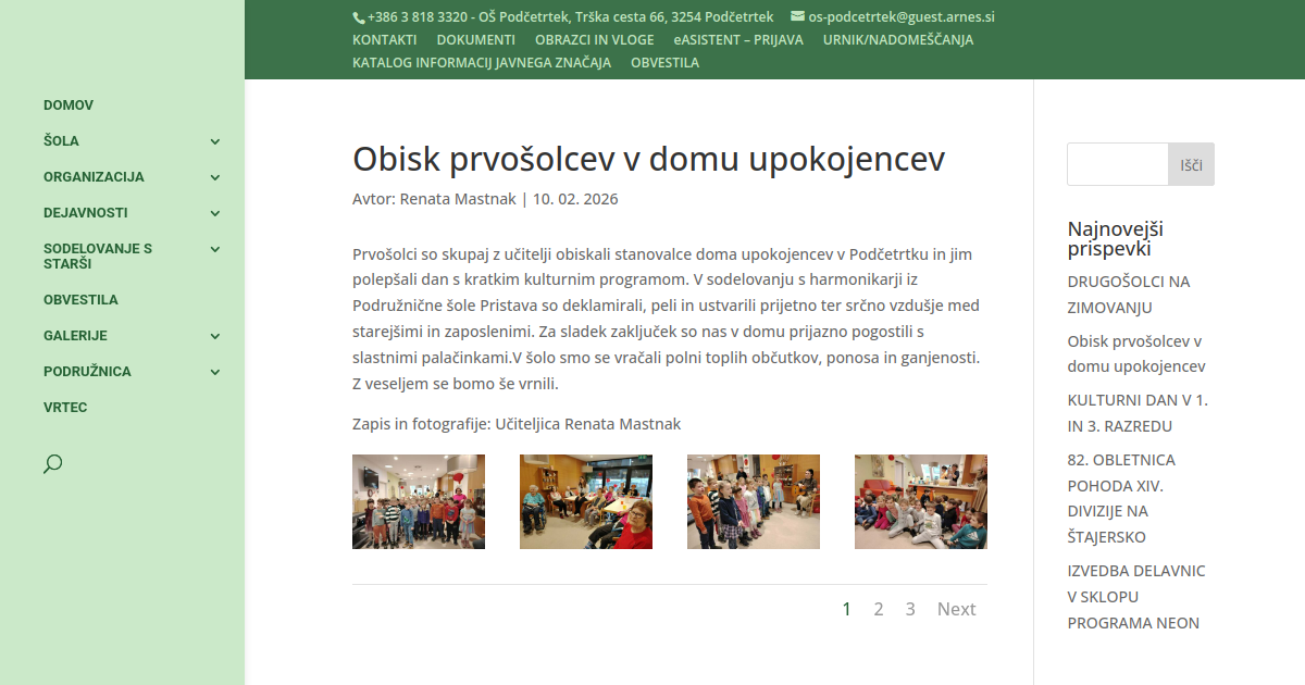 Prvošolci so skupaj z učitelji obiskali stanovalce doma upokojencev v Podčetrtku in jim polepšali dan s kratkim kulturnim programom. V sodelovanju s harmonikarji iz Podružnične šole Pristava so deklamirali, peli in ustvarili prijetno ter srčno vzdušje med starejšimi in zaposlenimi. Za sladek zaključek so nas v domu prijazno pogostili s slastnimi palačinkami.V šolo smo se vračali polni toplih občutkov, ponosa in ganjenosti. Z veseljem se bomo še vrnili.