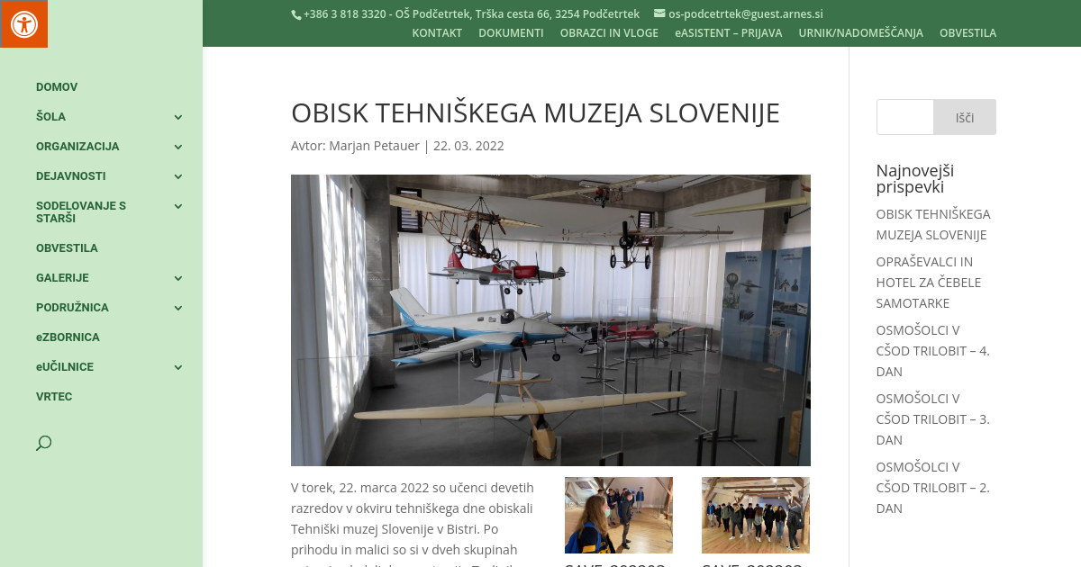 V torek, 22. marca 2022 so učenci devetih razredov v okviru tehniškega dne obiskali Tehniški muzej Slovenije v Bistri. Po prihodu in malici so si v dveh skupinah najprej ogledali demonstracijo Teslinih poskusov. Izvedeli so prednosti izmeničnega toka, se pred strelo skrili v Faradayevo kletko, si s pomočjo Van de Graaffovega generatorja uredili pričesko in slišali marsikaj zanimivega o Nikoli Tesli. Sledil je ogled pogonskih strojev, žage Venecijanke in elektro oddelka. Na koncu so si v prometnem oddelku ogledali zbirko koles, motorjev, traktorjev in avtomobilov ter se na ta način seznanili z razvojem avtomobilske tehnike skoz čas.