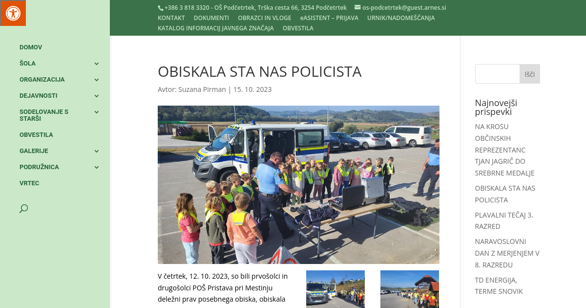 V četrtek, 12. 10. 2023, so bili prvošolci in drugošolci POŠ Pristava pri Mestinju deležni prav posebnega obiska, obiskala sta jih policista Matej Retuznik in Dejan Pogorevc iz Policijske postaje Šmarje pri Jelšah. Najprej sta učencem predstavila poklic, ki ga opravljata, jim pokazala opremo, ki jo policisti uporabljajo pri svojem delu ter jim razkazala policijski avtomobil. Nato so skupaj odšli na sprehod po bližnji okolici. Opazovali so promet in opisovali prometne znake, ki so jih videli ob cesti. Policist Matej je učence opozoril na nevarnosti in pasti na cesti. Opozoril jih je, da morajo prvošolci in drugošolci vsak dan imeti na poti v šolo in iz nje rumeno rutico. Ta jih bo naredila bolj vidne in zato bolj varne. Opozoril jih je tudi na to, da morajo biti med vožnjo v avtu vedno pripeti in na otroškem sedežu. Naučili so se pravilno in varno prečkati cesto po prehodu za pešce.