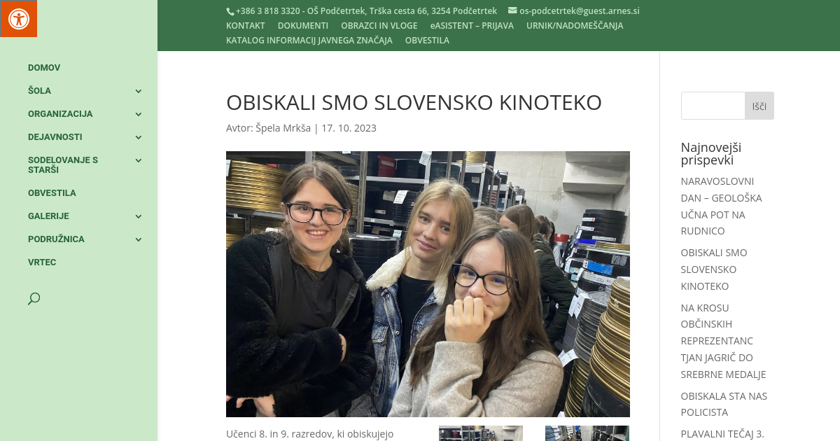 Učenci 8. in 9. razredov, ki obiskujejo izbirni predmet filmska vzgoja, so v ponedeljek, 16. 10. 2023, obiskali SLOVENSKO KINOTEKO – SLOVENSKI FILMSKI MUZEJ. Šolska ekskurzija je bila namenjena filmskemu opismenjevanju in spoznavanju zakulisja filmske umetnosti. Najprej smo si na Metelkovi ogledali filmske zbirke (zbirka Kinoteke obsega okoli 10.000 filmskih kopij) in obfilmske zbirke (scenariji, snemalne knjige, kostumske in scenografske skice, filmske kamere, filmski projektorji, plakati ipd.), po tem pa na Miklošičevi filmsko projekcijo Scott Pilgrim proti vsem, ki je nastala na podlagi stripa Bryana Leeja O’Malleya. Film opisuje prve ljubezni, hrupno glasbo in razbohotena čustva. Z liki v zgodbi filma se lahko poistoveti vsa mladina. Scott se mora boriti za svojo ljubezen Ramono, zato je v filmu tudi veliko akcijskih prizorov, ki so jih igralci v večini odigrali sami, za to pa sta jih pripravili legendarni kaskaderski ekipi Jackieja Chana in Jeta Lija. Po ogledu je sledil pogovor o filmu.