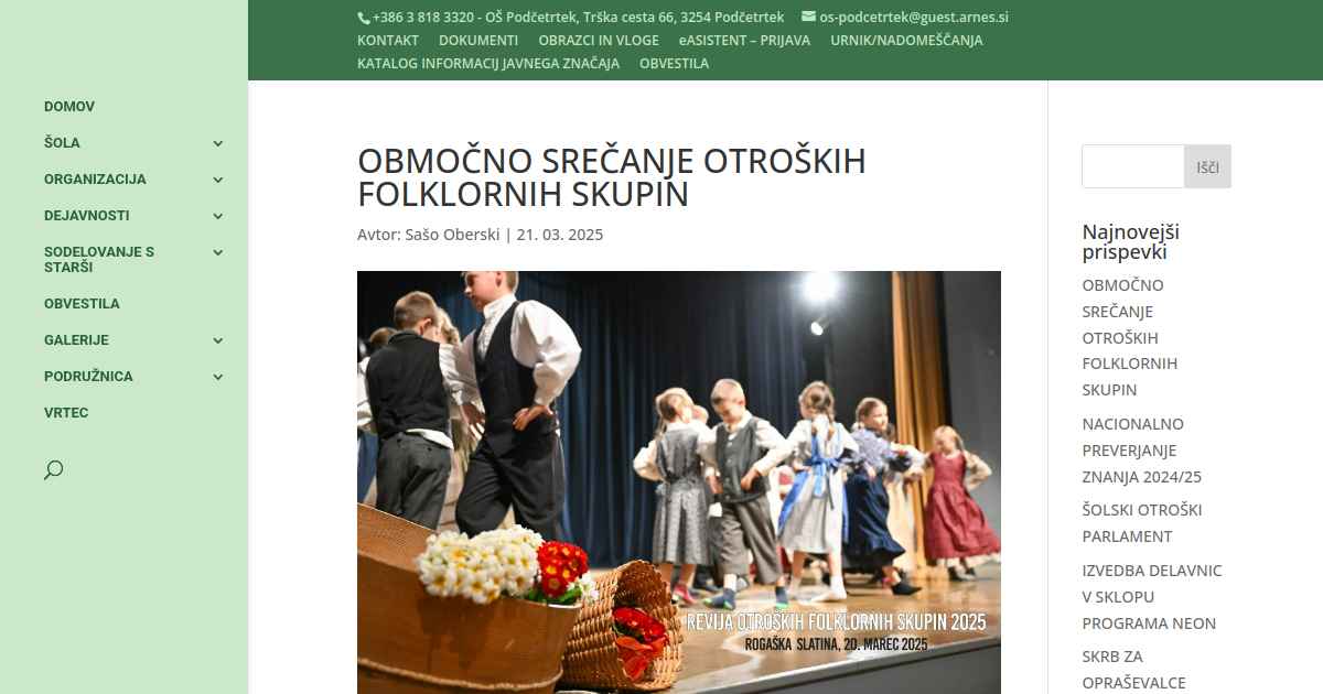 Dere sen jaz mali bija, te je luštno blo… Najverjetneje se vsi spominjamo te ljudske pesmi, ki poje o prleškem študentu in je od nekdaj prleška himna. Original te pesmi ima več kot 40 kitic. Učenci obeh otroških folklornih skupin, mlajše in starejše, so na območnem srečanju otroških folklornih skupin v Rogaški Slatini predstavili koreografijo Ko sem še majhen bil, ki vključuje omenjeno pesem, V koreografiji so predstavili odraslega moža, ki ga tarejo “vsakdanje” skrbi. V mislih se vrača v brezskrbno otroštvo, polno smeha petja in iger. Učenci so še v koreografiji predstavili ljudske plese zibenšrit, pobreško polko in pastirico. Uživali so vsi, gledalci, nastopajoči, navsezadnje pa je ponosen na njih tudi njihov mentor.