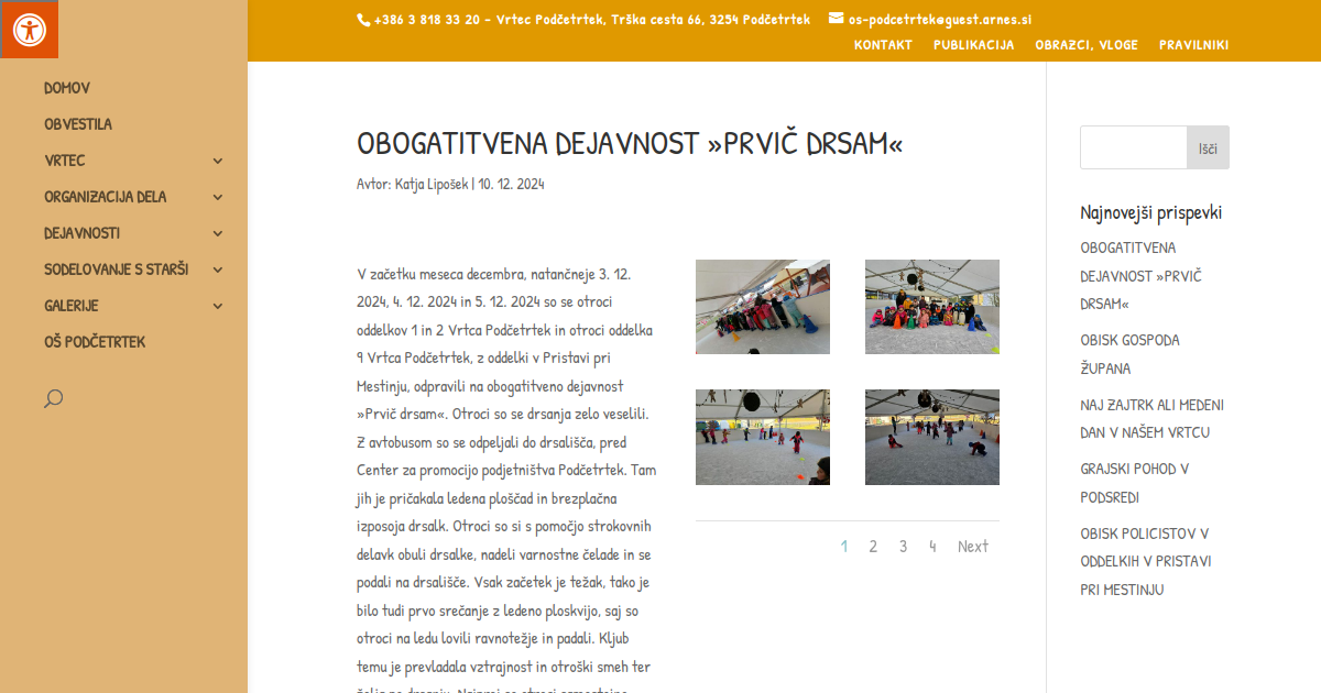 V začetku meseca decembra, natančneje 3. 12. 2024, 4. 12. 2024 in 5. 12. 2024 so se otroci oddelkov 1 in 2 Vrtca Podčetrtek in otroci oddelka 9 Vrtca Podčetrtek, z oddelki v Pristavi pri Mestinju, odpravili na obogatitveno dejavnost »Prvič drsam«. Otroci so se drsanja zelo veselili. Z avtobusom so se odpeljali do drsališča, pred Center za promocijo podjetništva Podčetrtek. Tam jih je pričakala ledena ploščad in brezplačna izposoja drsalk. Otroci so si s pomočjo strokovnih delavk obuli drsalke, nadeli varnostne čelade in se podali na drsališče. Vsak začetek je težak, tako je bilo tudi prvo srečanje z ledeno ploskvijo, saj so otroci na ledu lovili ravnotežje in padali. Kljub temu je prevladala vztrajnost in otroški smeh ter želja po drsanju. Najprej so otroci samostojno preizkušali ledeno ploščad, da so pridobili občutek za drsanje, nato pa so sledili navodilom strokovnih delavk, ki so jih usmerjale k izvajanju iger ravnotežja. Otroke so prav tako naučile kako se pravilno pade na ledu ter kako se vstane. Preko uporabe različnih športnih pripomočkov so otroci postopoma osvajali osnove drsanja. Otroci in celoten kolektiv Vrtca Podčetrtek se za tako bogato izkušnjo iskreno zahvaljujemo TIC-u Podčetrtek in Občini Podčetrtek, ki sta nam omogočila brezplačno izposojo drsalk in brezplačen obisk drsališča. Zahvaljujemo se tudi našemu vodstvu, ki nam je omogočilo brezplačno vožnjo z avtobusnim prevozom do drsališča in nazaj. Foto: strokovne delavke oddelkov