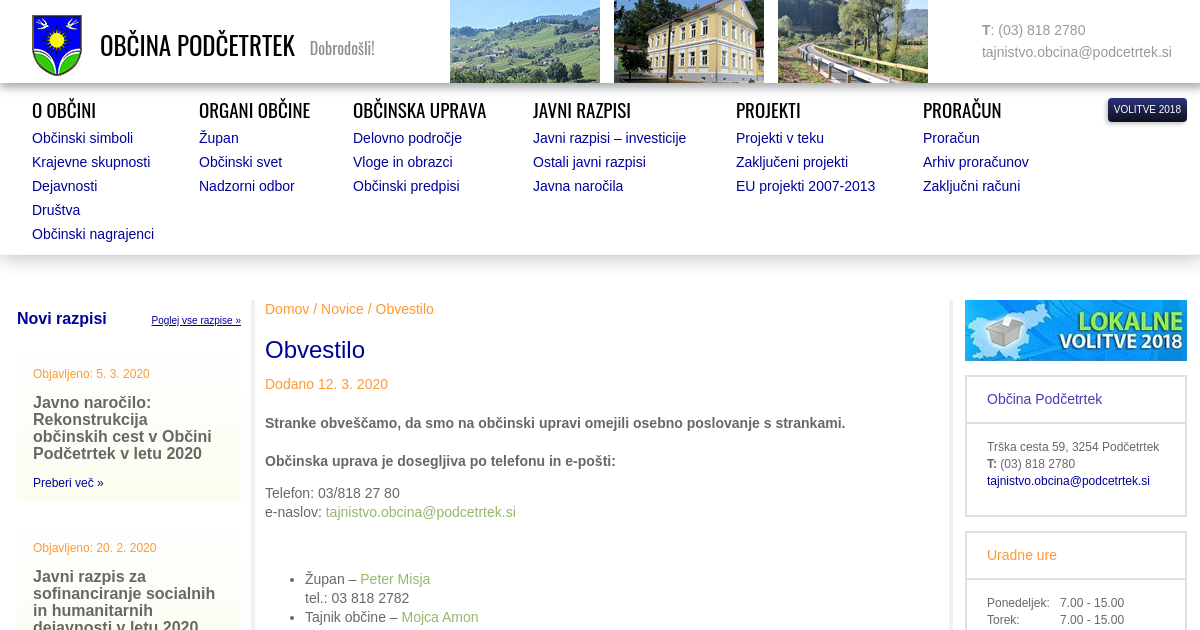 Stranke obveščamo, da smo na občinski upravi omejili osebno poslovanje s strankami. Občinska uprava je dosegljiva po telefonu in e-pošti: Telefon: 03/818 27 80 e-naslov: tajnistvo.obcina@podcetrtek.si Župan – Peter Misja tel.: 03 818 2782 Tajnik občine – Mojca Amon tel.: 03 818 2780 Višja svetovalka za finance in družbene dejavnosti – Simona Šelekar tel.: 03 818