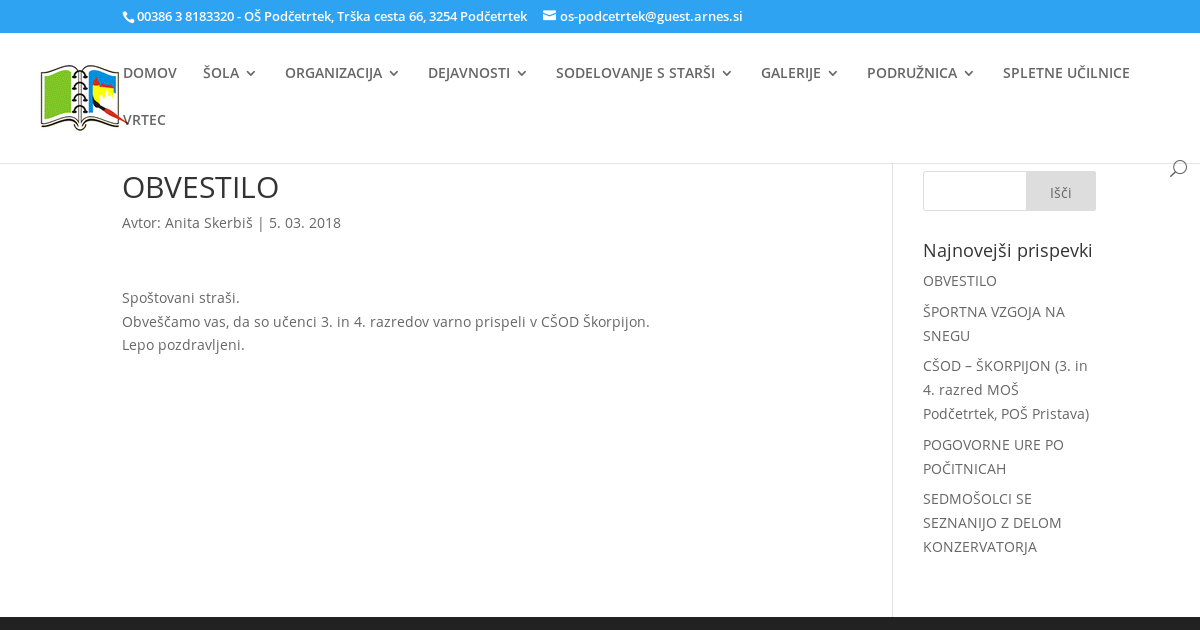 Spoštovani straši. Obveščamo vas, da so učenci 3. in 4. razredov varno prispeli v CŠOD Škorpijon. Lepo pozdravljeni.