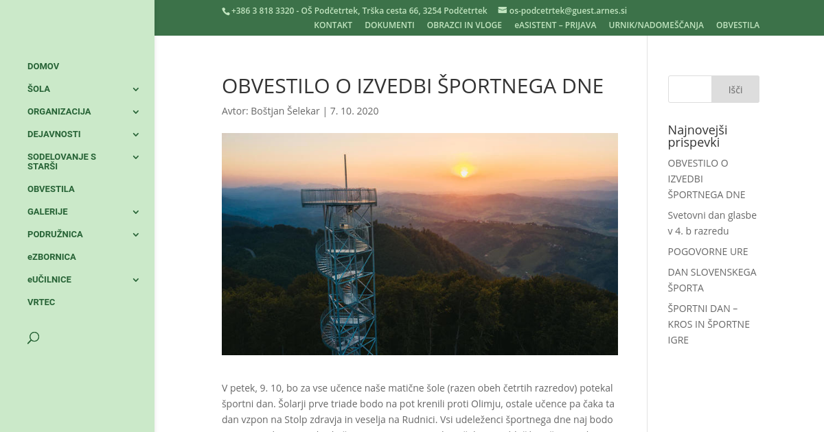 V petek, 9. 10, bo za vse učence naše matične šole (razen obeh četrtih razredov) potekal športni dan. Šolarji prve triade bodo na pot krenili proti Olimju, ostale učence pa čaka ta dan vzpon na Stolp zdravja in veselja na Rudnici. Vsi udeleženci športnega dne naj bodo primerno obuti za pohodništvo in naj imajo na sebi večplastna oblačila. Učencem bo pred odhodom razdeljena malica za na pot, a kakšen dodaten priboljšek iz nahrbtnika je prav tako dobrodošel. Vsak učenec mora imeti s sabo tudi dovolj vode. Ker bo dan v znamenju gibanja, pozivamo, da čim več učencev predmetne stopnje pride v šolo s kolesom (ne pozabite na čelade) in s tem še dodatno nadgradi svoj športni dan.