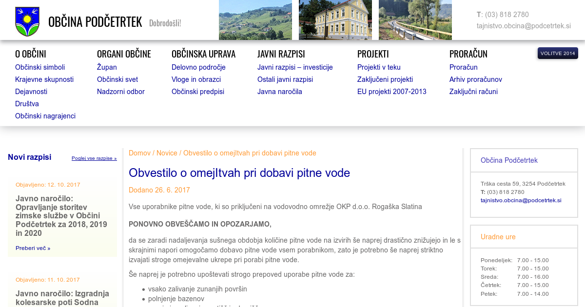 Vse uporabnike pitne vode, ki so priključeni na vodovodno omrežje OKP d.o.o. Rogaška Slatina PONOVNO OBVEŠČAMO IN OPOZARJAMO, da se zaradi nadaljevanja sušnega obdobja količine pitne vode na izvirih še naprej drastično znižujejo in le s skrajnimi napori omogočamo dobavo pitne vode vsem porabnikom, zato je potrebno še naprej striktno izvajati stroge omejevalne ukrepe pri