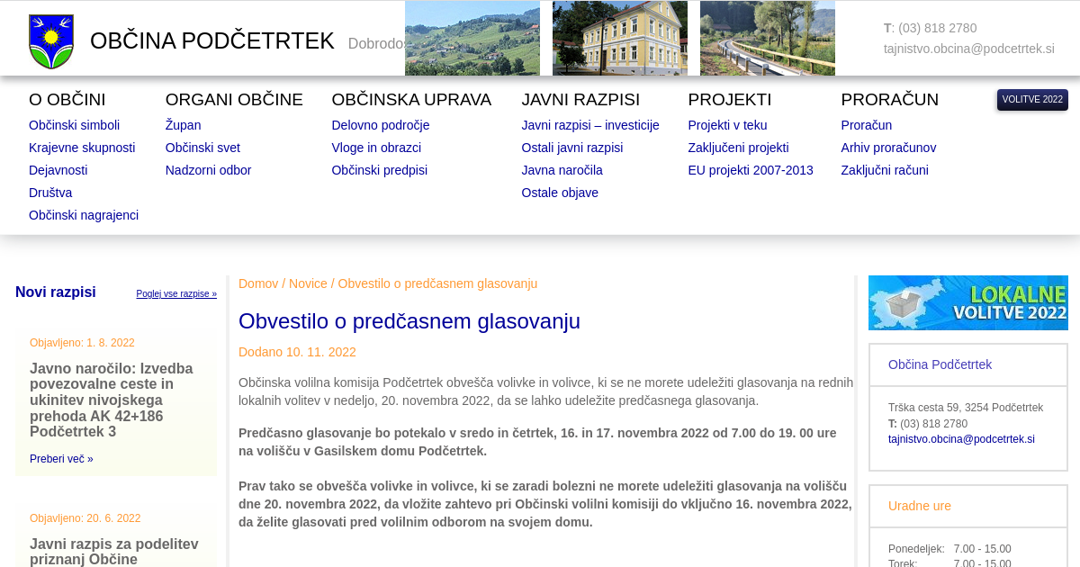 Občinska volilna komisija Podčetrtek obvešča volivke in volivce, ki se ne morete udeležiti glasovanja na rednih lokalnih volitev v nedeljo, 20. novembra 2022, da se lahko udeležite predčasnega glasovanja. Predčasno glasovanje bo potekalo v sredo in četrtek, 16. in 17. novembra 2022 od 7.00 do 19. 00 ure na volišču v Gasilskem domu Podčetrtek. Prav