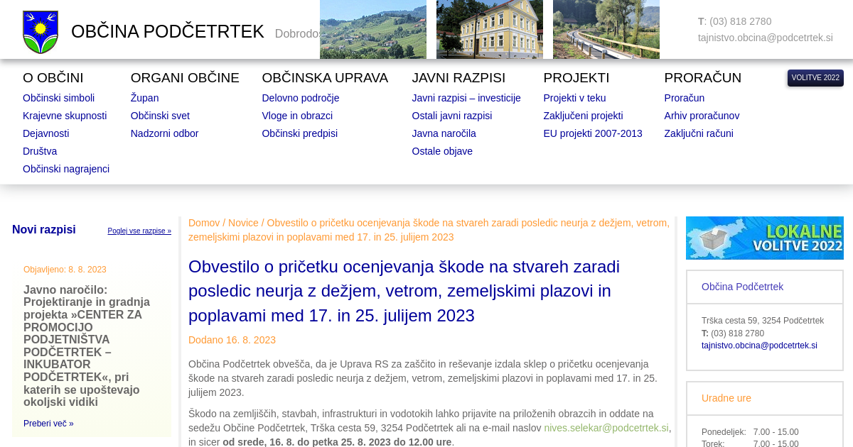 Občina Podčetrtek obvešča, da je Uprava RS za zaščito in reševanje izdala sklep o pričetku ocenjevanja škode na stvareh zaradi posledic neurja z dežjem, vetrom, zemeljskimi plazovi in poplavami med 17. in 25. julijem 2023. Škodo na zemljiščih, stavbah, infrastrukturi in vodotokih lahko prijavite na priloženih obrazcih in oddate na sedežu Občine Podčetrtek, Trška cesta