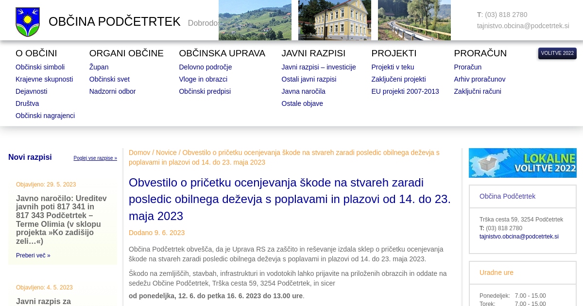 Občina Podčetrtek obvešča, da je Uprava RS za zaščito in reševanje izdala sklep o pričetku ocenjevanja škode na stvareh zaradi posledic obilnega deževja s poplavami in plazovi od 14. do 23. maja 2023. Škodo na zemljiščih, stavbah, infrastrukturi in vodotokih lahko prijavite na priloženih obrazcih in oddate na sedežu Občine Podčetrtek, Trška cesta 59, 3254