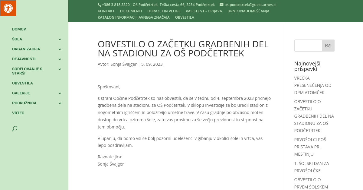 OBVESTILO O ZAČETKU GRADBENIH DEL NA STADIONU ZA OŠ PODČETRTEK