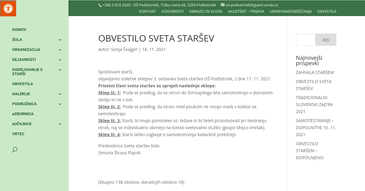 Spoštovani starši, objavljamo izvleček sklepov 3. sestanka Sveta staršev OŠ Podčetrtek, z dne 17. 11. 2021. Prisotni člani sveta staršev so sprejeli naslednje sklepe: Sklep št. 1: Poda se predlog, da se otroci do štirinajstega leta samotestirajo v domačem okolju in ne v šoli. Sklep št. 2: Poda se predlog, da otroci med poukom ne nosijo mask v kolikor se samotestirajo. Sklep št. 3: Starši, ki imajo pomisleke oz. težave in bi želeli prisostvovati pri testiranju otrok, naj se individualno obrnejo na šolsko svetovalno službo (gospo Mojco Vrešak). Sklep št. 4: Starši lahko soglasje o samotestiranju kadarkoli prekličejo