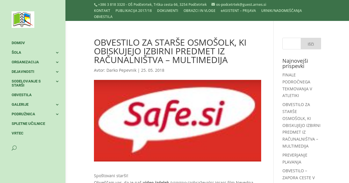 Spoštovani starši! Obveščam vas, da je naš video izdelek (vzgojno-izobraževalni igrani film Nevedna Frida), ki je nastal v okviru izbirnega predmeta Multimedija med nagrajenimi. Zaključna prireditev video natečaja “Safe.si 2017/18” bo v sredo, 30. 5. 2018, v Ljubljani. S klikom na spodnji gumb si lahko preberete vse podrobnosti izvedbe in vsebine dejavnosti. Na zadnji strani boste našli tudi obrazec vašega soglasja. Izpolnjeno in podpisano soglasje je pogoj za udeležbo učenke na zaključnem dogodku, zato ga nemudoma izpolnite in pošljite meni.