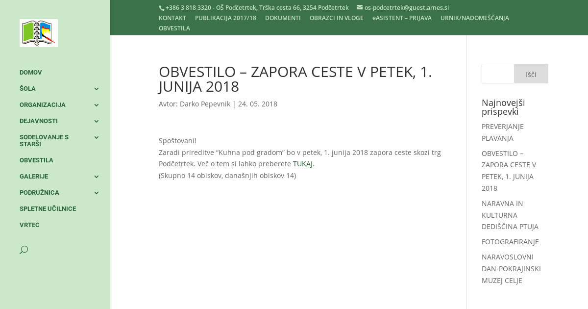 Spoštovani! Zaradi prireditve “Kuhna pod gradom” bo v petek, 1. junija 2018 zapora ceste skozi trg Podčetrtek. Več o tem si lahko preberete TUKAJ.