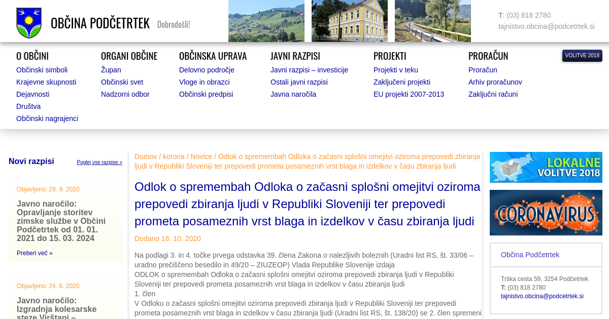 Na podlagi 3. in 4. točke prvega odstavka 39. člena Zakona o nalezljivih boleznih (Uradni list RS, št. 33/06 – uradno prečiščeno besedilo in 49/20 – ZIUZEOP) Vlada Republike Slovenije izdaja ODLOK o spremembah Odloka o začasni splošni omejitvi oziroma prepovedi zbiranja ljudi v Republiki Sloveniji ter prepovedi prometa posameznih vrst blaga in izdelkov v