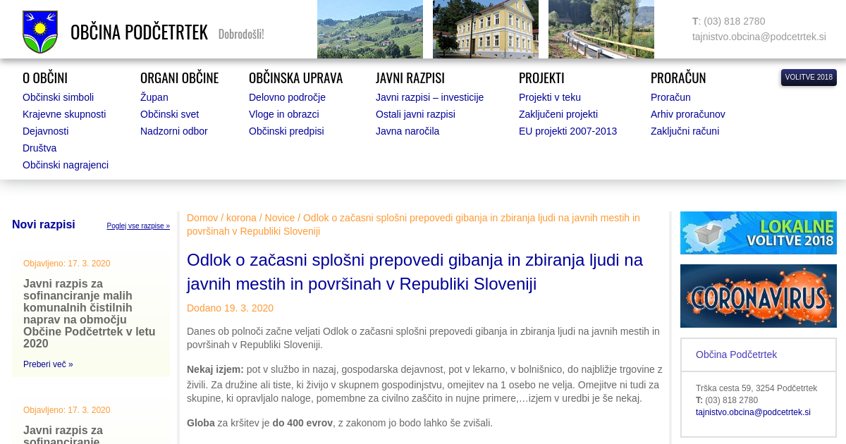 Danes ob polnoči začne veljati Odlok o začasni splošni prepovedi gibanja in zbiranja ljudi na javnih mestih in površinah v Republiki Sloveniji. Nekaj izjem: pot v službo in nazaj, gospodarska dejavnost, pot v lekarno, v bolnišnico, do najbližje trgovine z živili. Za družine ali tiste, ki živijo v skupnem gospodinjstvu, omejitev na 1 osebo ne velja. Omejitve ni tudi za