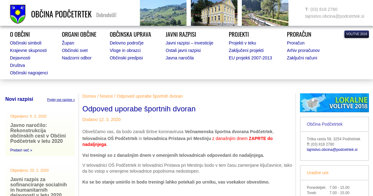 Obveščamo vas, da bodo zaradi širitve koronavirusa Večnamenska športna dvorana Podčetrtek, telovadnica OŠ Podčetrtek in telovadnica Pristava pri Mestinju z današnjim dnem ZAPRTE do nadaljnjega. Vsi treningi so z današnjim dnem v omenjenih telovadnicah odpovedani do nadaljnjega. V telovadnici OŠ Podčetrtek in telovadnici Pristava pri Mestinju bodo v tem času zamenjane ključavnice, tako da bo vstop