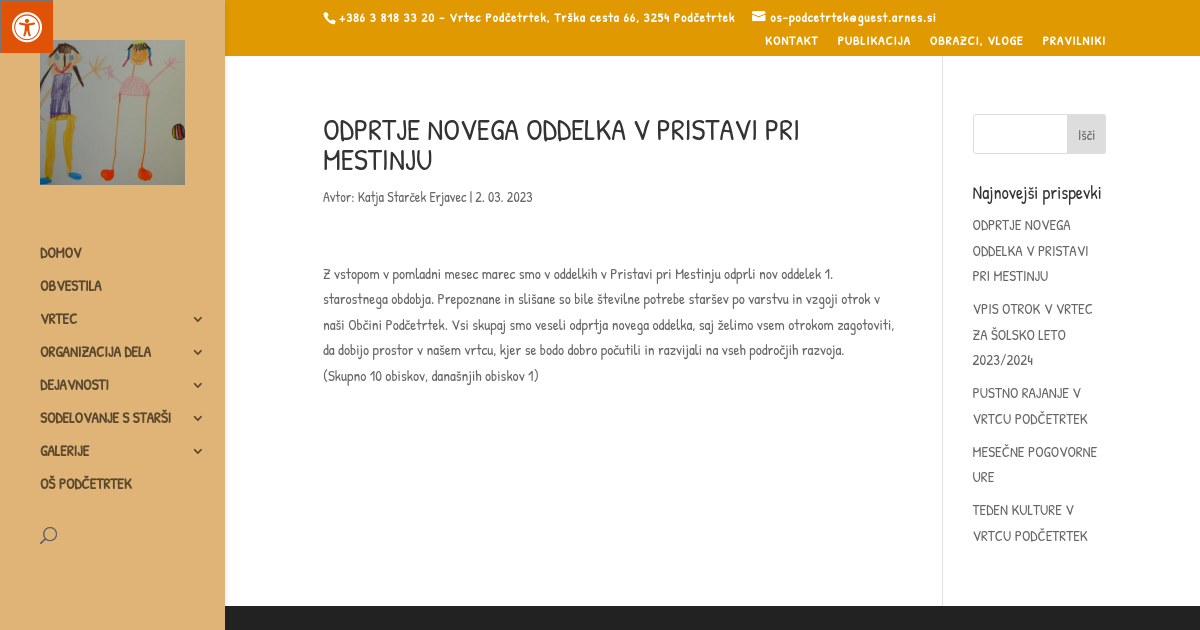 Z vstopom v pomladni mesec marec smo v oddelkih v Pristavi pri Mestinju odprli nov oddelek 1. starostnega obdobja. Prepoznane in slišane so bile številne potrebe staršev po varstvu in vzgoji otrok v naši Občini Podčetrtek. Vsi skupaj smo veseli odprtja novega oddelka, saj želimo vsem otrokom zagotoviti, da dobijo prostor v našem vrtcu, kjer se bodo dobro počutili in razvijali na vseh področjih razvoja.