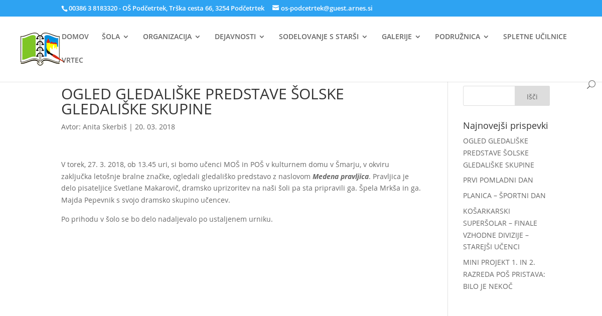 V torek, 27. 3. 2018, ob 13.45 uri, si bomo učenci MOŠ in POŠ v kulturnem domu v Šmarju, v okviru zaključka letošnje bralne značke, ogledali gledališko predstavo z naslovom Medena pravljica. Pravljica je delo pisateljice Svetlane Makarovič, dramsko uprizoritev na naši šoli pa sta pripravili ga. Špela Mrkša in ga. Majda Pepevnik s svojo dramsko skupino učencev.