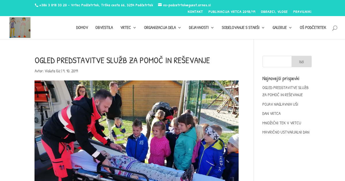 V petek, 3.10.2019, so se otroci iz vrtca Podčetrtek (1. in 2. oddelek iz Podčetrtka ter 8. oddelek iz Pristave pri Mestinju) udeležili predstavitve služb za pomoč in reševanje v Športnem parku Šmarje pri Jelšah. Zbrani policisti, gasilci, reševalci, jamarji, predstavniki civilne zaščite, kinološkega društva ter vlečne službe so otroke seznanili s svojim delom, vozili in opremo, demonstrirali nekatere tehnike reševanja ter iskanja pogrešanih oseb in nevarnih substanc. Otroci so se še posebno razveselili priložnosti sesti na policijski motor, ogledali so si notranjost marice, preizkusili delovanje gasilske cevi, izmerili svoj srčni utrip ter se povzpeli na prikolico vozila vlečne službe. Tako smo skupaj preživeli zanimivo in tudi poučno dopoldne.