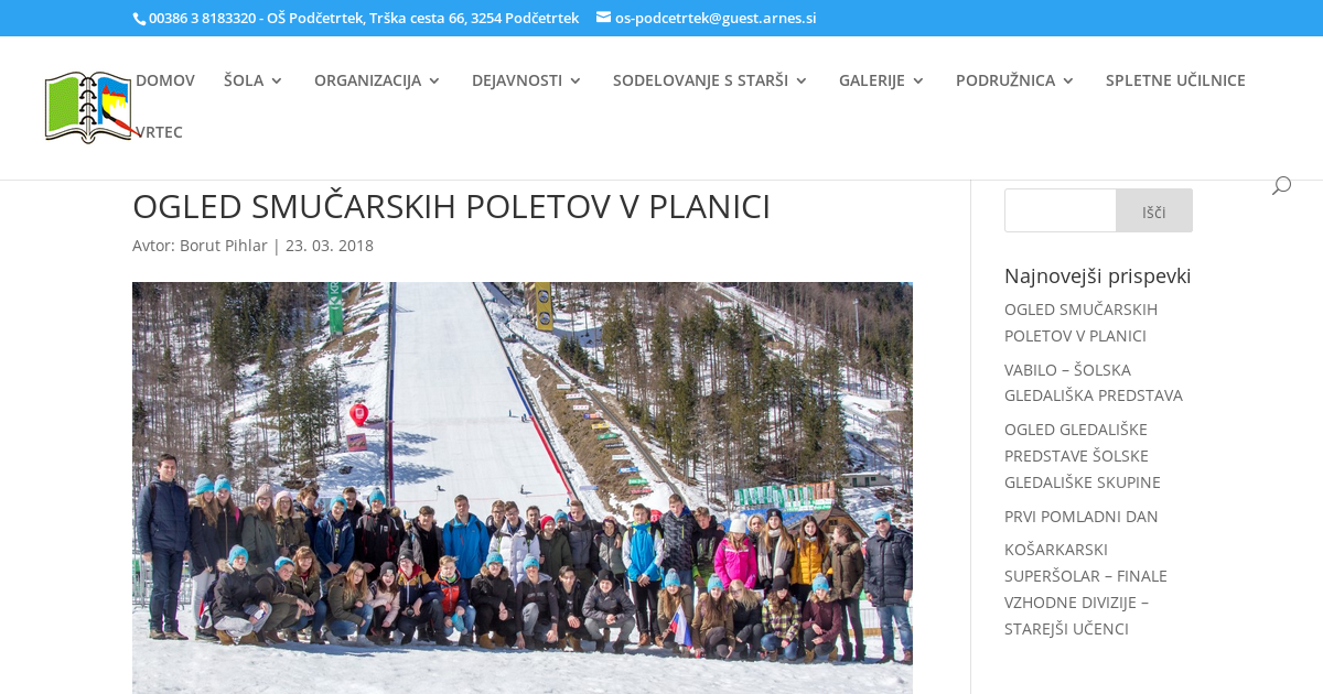 V četrtek, 23. 3., smo se odpravili na polete v dolino pod Poncami. Najmnožičnejše slovenske športne prireditve so se udeležili učenci osmih razredov, ki so uspešno zastopali barve naše šole na državnem šolskem tekmovanju v nogometu in košarki, ter vsi devetošolci. Dan je ponudil čudovito sončno vreme v katerem je bil ogled poletov še toliko lepši. Naši šolarji so glasno navijali za naše orle, videli pa smo tudi izenačitev svetovnega rekorda v poletih 253,5 m, ki ga je dosegel Avstrijec Gregor Schlierenzauer, vendar zaradi podrsa z rokami rekord ni bil priznan. Po zaključku kvalifikacijske serije smo na glavnem prireditvenem odru prisluhnili govoru predsednika Boruta Pahorja in nastopu skupine BQL, ter se polni lepih vtisov odpravili proti domu. Ob koncu bi se radi zahvalili Zavarovalnici Triglav, ki je našim šolarjem omogočila brezplačen ogled prireditve.