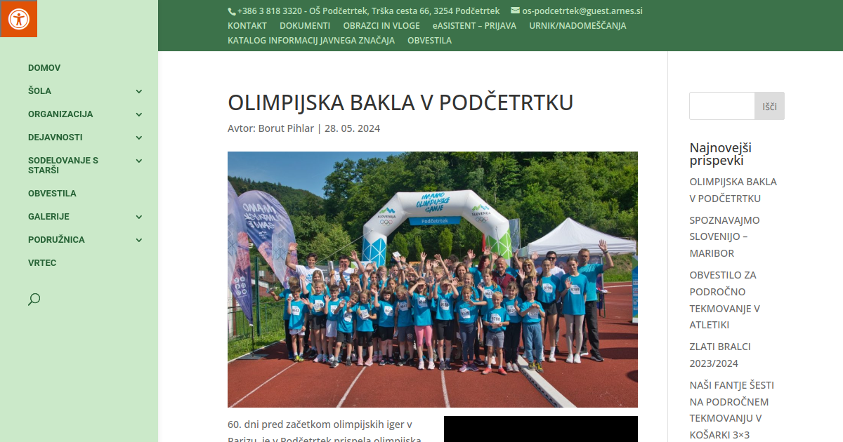 60. dni pred začetkom olimpijskih iger v Parizu, je v Podčetrtek prispela olimpijska bakla. Olimpijski ogenj je poleg krogov najznačilnejši simbol olimpijskih iger. Prižiganje olimpijskega ognja (vsake štiri leta) je velik medijski dogodek. Olimpijski ogenj gori neprekinjeno med izvajanjem posameznih olimpijskih iger, ob koncu tekmovanja pa ga s posebnim obredom ugasnejo na sklepni slovesnosti. Slovenska bakla, ki so jo izdelali jeklarji v Ravnah na Koroškem, na poti po vseh slovenskih občinah širi vrednote olimpizma. Svoj kamenček v ta mozaik so danes dodali tudi učenci naše šole. Nosilcem slovenske olimpijske bakle sta se pridružila tudi župan občine Podčetrtek g. Peter Misja in naša nekdanja rekorderka v troskoku Anja Valant Velepec. »Nihče ti v življenju ne more dati zagotovila, da boš postal najboljši, vedno pa se lahko zaneseš na svojo jekleno voljo. Ta je edino zagotovilo, da se dan za dnem trudiš postati boljši in dosežeš svoj cilj. Zato prebudi v sebi jekleno voljo!« (Petra Majdič)