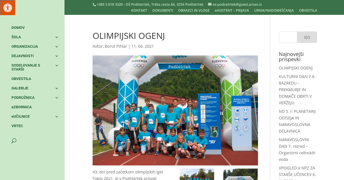 43. dni pred začetkom olimpijskih iger Tokio 2021, je v Podčetrtek prispel olimpijski ogenj. Olimpijski ogenj je poleg krogov najznačilnejši simbol olimpijskih iger. Prižiganje olimpijskega ognja (vsake štiri leta) je velik medijski dogodek. Olimpijski ogenj gori neprekinjeno med izvajanjem posameznih olimpijskih iger, ob koncu tekmovanja pa ga s posebnim obredom ugasnejo na sklepni slovesnosti. Slovenska bakla, ki so jo izdelali jeklarji v Ravnah na Koroškem, na poti po vseh slovenskih občinah širi vrednote olimpizma. Svoj kamenček v ta mozaik so danes dodali tudi otroci našega vrtca in učenci naše šole. »Nihče ti v življenju ne more dati zagotovila, da boš postal najboljši, vedno pa se lahko zaneseš na svojo jekleno voljo. Ta je edino zagotovilo, da se dan za dnem trudiš postati boljši in dosežeš svoj cilj. Zato prebudi v sebi jekleno voljo!« (Petra Majdič)