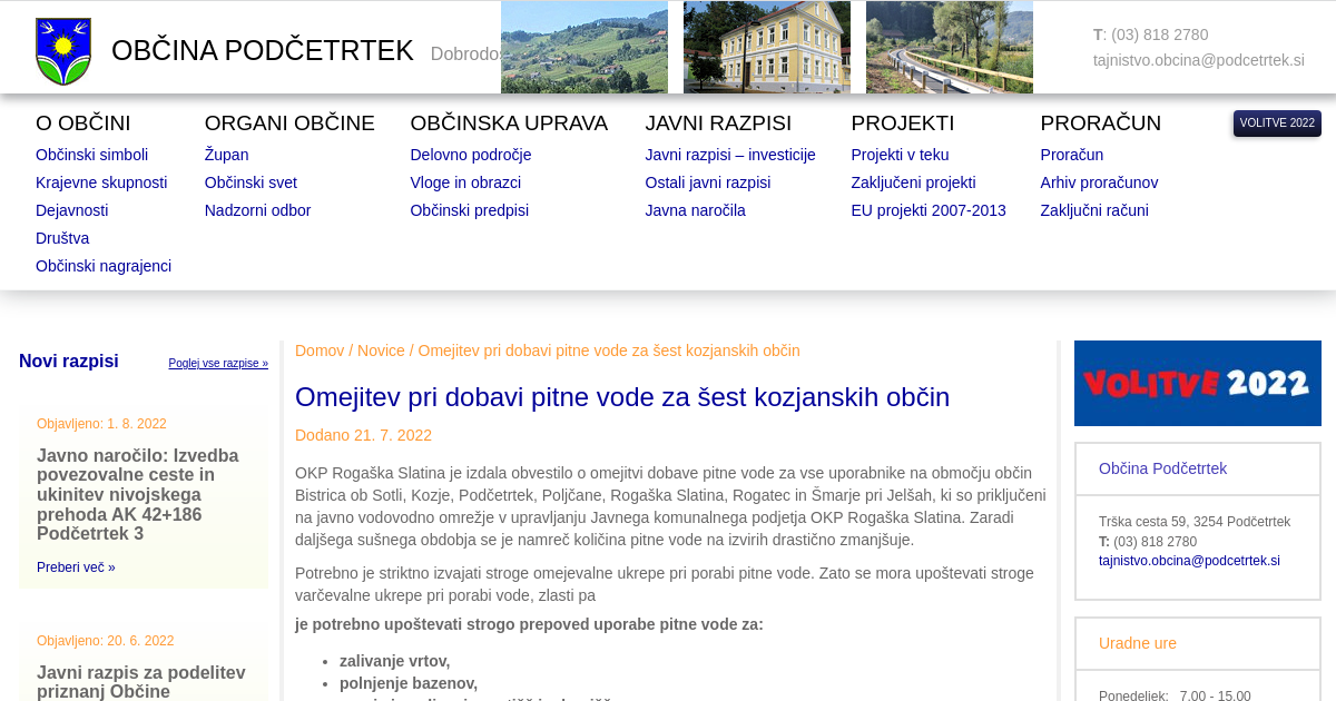 OKP Rogaška Slatina je izdala obvestilo o omejitvi dobave pitne vode za vse uporabnike na območju občin Bistrica ob Sotli, Kozje, Podčetrtek, Poljčane, Rogaška Slatina, Rogatec in Šmarje pri Jelšah, ki so priključeni na javno vodovodno omrežje v upravljanju Javnega komunalnega podjetja OKP Rogaška Slatina. Zaradi daljšega sušnega obdobja se je namreč količina pitne vode