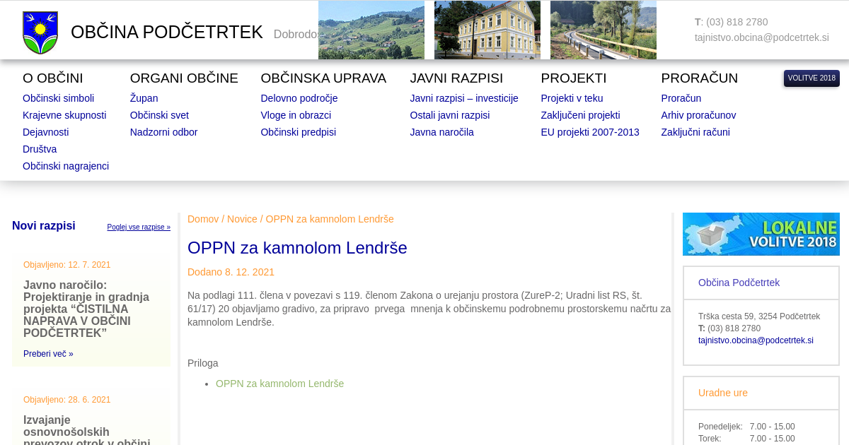 Na podlagi 111. člena v povezavi s 119. členom Zakona o urejanju prostora (ZureP-2; Uradni list RS, št. 61/17) 20 objavljamo gradivo, za pripravo prvega mnenja k občinskemu podrobnemu prostorskemu načrtu za kamnolom Lendrše. Priloga OPPN za kamnolom Lendrše