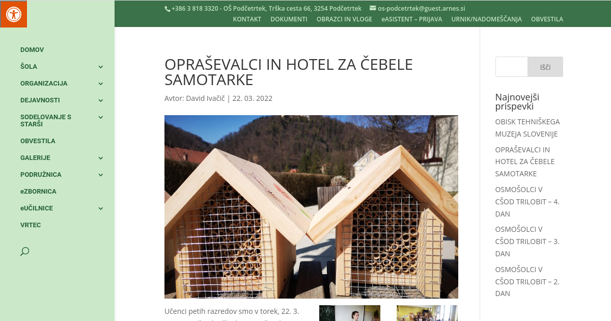 Učenci petih razredov smo v torek, 22. 3. 2022 izvedli tehniški dan Opraševalci in hotel za čebele samotarke. Obiskale so nas zaposlene v Kozjanskem parku, ki so nam zjutraj razložile pomen čebel samotark za obstoj in raznolikost narave. Spoznali smo življenjski krog čebele samotarke in njen pomen pri opraševanju rastlin. Po malici smo pričeli z izdelovanjem hotelov za čebele samotarke, ki bodo odslej krasili okolico domov učencev. Seveda smo izdelali enega tudi za našo učilnico na prostem. Spoznali smo še delovanje WIFI prenosnega mikroskopa, ki nam je omogočil odličen vpogled v bivališče in samo zgradbo čebele samotarke. Dan smo zaključili s poučnim kvizom. Hvala zaposlenim v Kozjanskem parku za odlično izveden dan dejavnosti.