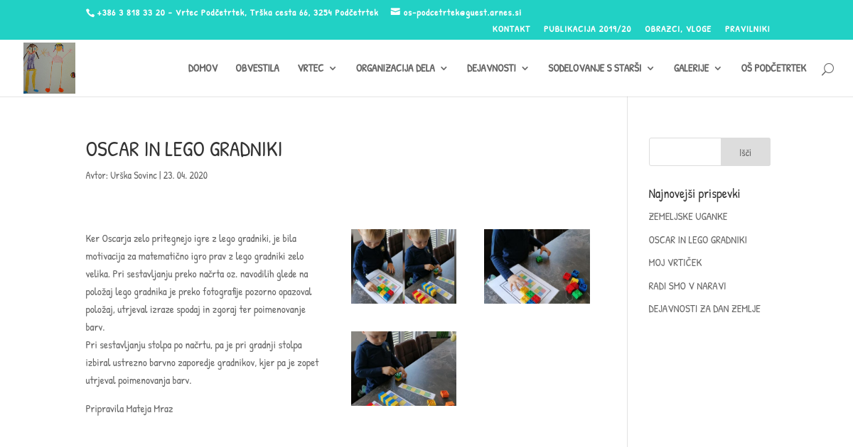 Ker Oscarja zelo pritegnejo igre z lego gradniki, je bila motivacija za matematično igro prav z lego gradniki zelo velika. Pri sestavljanju preko načrta oz. navodilih glede na položaj lego gradnika je preko fotografije pozorno opazoval položaj, utrjeval izraze spodaj in zgoraj ter poimenovanje barv. Pri sestavljanju stolpa po načrtu, pa je pri gradnji stolpa izbiral ustrezno barvno zaporedje gradnikov, kjer pa je zopet utrjeval poimenovanja barv.