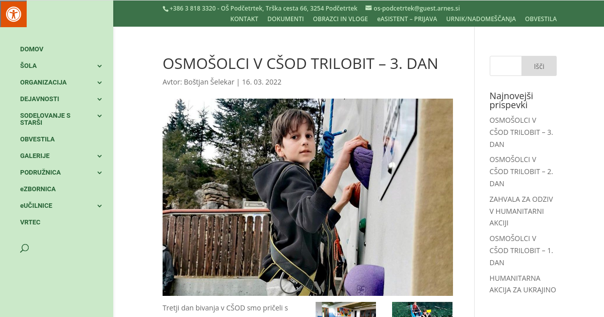 Tretji dan bivanja v CŠOD smo pričeli s pohodom na Lipane, kjer smo s kladivom kresali iskre na kremenu in si ogledali ostanke pražilnih peči. Popoldan smo se preizkusili v plezanju in utrdili tehniko veslanja s kanujem. V večernih urah smo s pomočjo programa Stop motion izdelali kratke filme. Nekaj izdelkov vam spodaj tudi predstavljamo.