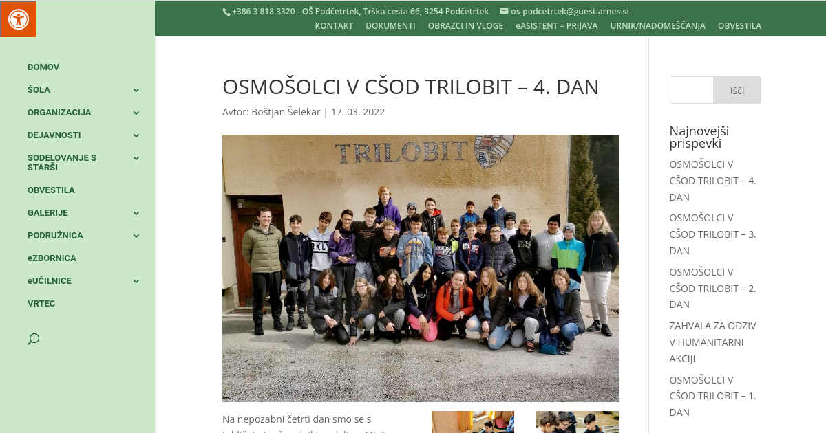 Na nepozabni četrti dan smo se s tabličnimi računalniki podali na Misijo CŠOD in se s pomočjo te zanimive aplikacije preizkusili v orientaciji. V nadaljevanju smo si ogledali sistem delovanja stare hidroelektrarne Javorniški Rovt, izdelovali okraske iz marmorja ter naredili odlitke fosilov. Po večerji smo sošolko prijetno presenetili z rojstnodnevno torto in se za konec dneva sproščeno zavrteli na plesišču.