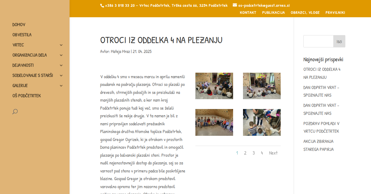 V oddelku 4 smo v mesecu marcu in aprilu namenili poudarek na področju plezanja. Otroci so plezali po drevesih, strmejših pobočjih in se preizkušali na manjših plezalnih stenah, a ker nam kraj Podčetrtek ponuja tudi kaj več, smo se želeli preizkusiti še nekje drugje. V ta namen je bil z nami pripravljen sodelovati predsednik Planinskega društva Atomske toplice Podčetrtek, gospod Gregor Ogrizek, ki je otrokom v prostorih Doma planincev Podčetrtek predstavil in omogočil plezanje po balvanski plezalni steni. Prostor je nudil najenostavnejši dostop do plezanja, saj so za varnost pod steno v primeru padca bile poskrbljene blazine. Gospod Gregor je otrokom predstavil varovalno opremo ter jim nazorno predstavil načine za varno plezanje. Otroke je ustrezno pripravil na aktivno plezanje ter jih na igriv način spodbudil in ob tem motiviral k samozavestnejšemu sodelovanju. Otroci so preizkušali svoje zmogljivosti in urili mišice, ki so potrebne za samo dejavnost ter pozivali k pozornosti ob njihovem uspehu.