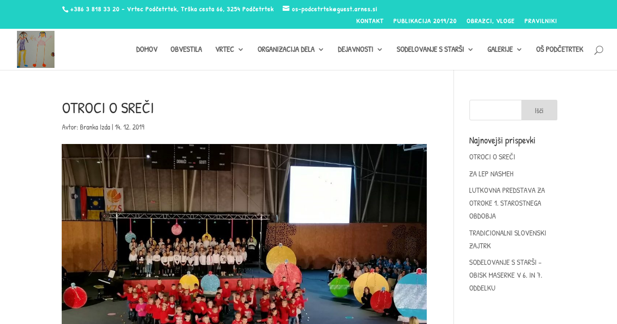 Vstopili smo v čarobni čas, čas prijetnih pričakovanj, veselja in obdarovanja. Vzdušje v vrtcu je prijetno, igrivo in obarvano s prazničnimi dejavnostmi. V starejših oddelkih Vrtca Podčetrtek (oddelki 1, 2, 8) smo s pomočjo pravljice »Kako sta Bibi in Gusti sipala srečo« razmišljali o sreči. S skupnim sodelovanjem in povezovanjem otrok in strokovnih delavk smo sestavili kratek filmček, kjer so otroci odgovarjali na vprašanja o sreči, in sicer: kaj je, kakšna je, kje se skriva in kdaj jo dobimo. Filmček »O sreči« je bil uvod k »srčkasti« plesni točki na dobrodelni prireditvi »Otroci otrokom«. Upamo oz. verjamemo, da smo z našimi dejanji »posipali« srečo na vse vas.